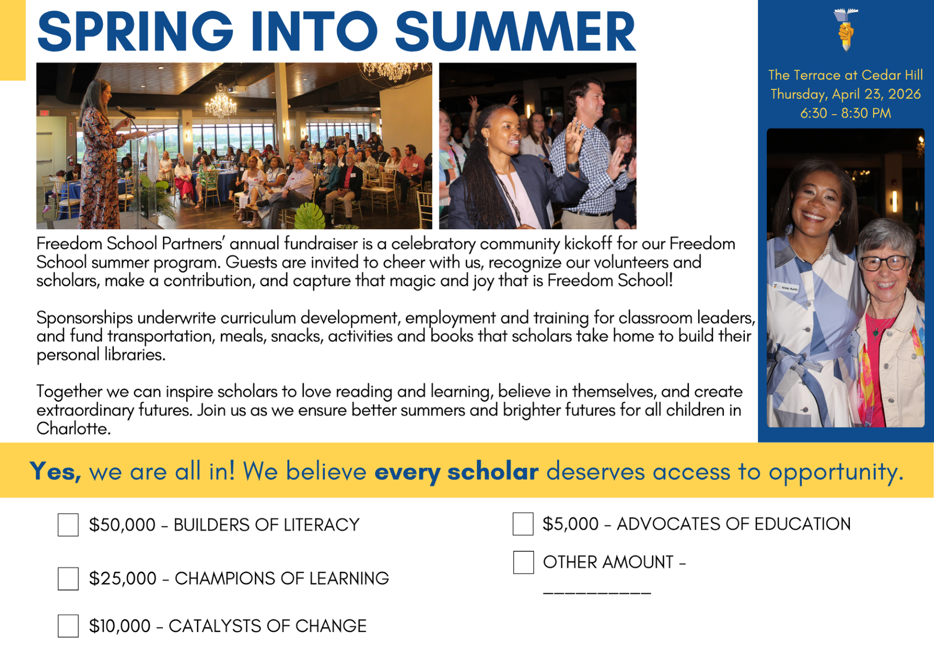 Freedom School Partners’ annual fundraiser is a community celebration that kicks off our Freedom School summer program. Guests come together to cheer with us, honor our volunteers and scholars, and capture the magic and joy that is Freedom School.